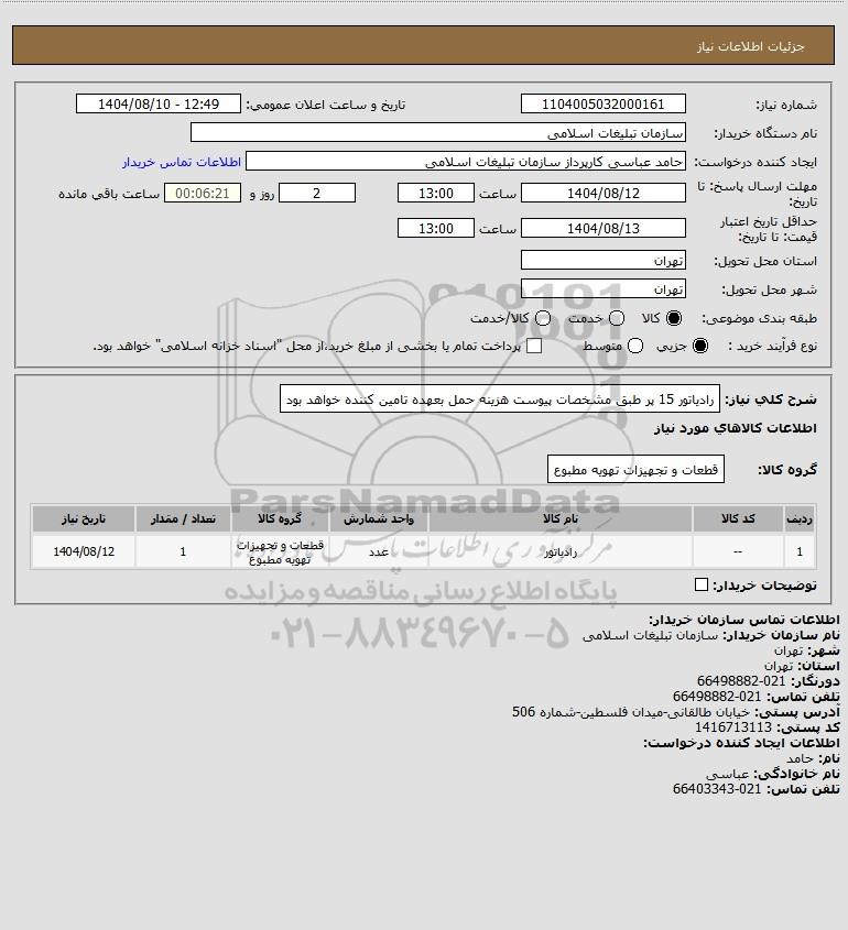 شرح کلی نیاز: رادیاتور 15 پر طبق مشخصات پیوست