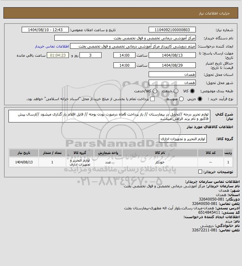 | 1 | -- | خودکار | عدد | لوازم التحریر و تجهیزات اداری | 1 | 1404/08/13 |