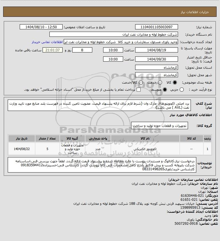 شرح کلی نیاز: برد اصلی اکچویتورهای مارک وان {شرط لازم برای ارائه پشنهاد قیمت، عضویت تامین کننده در فهرست بلند منابع مورد تایید وزارت نفت (AVL ) می باشد}
