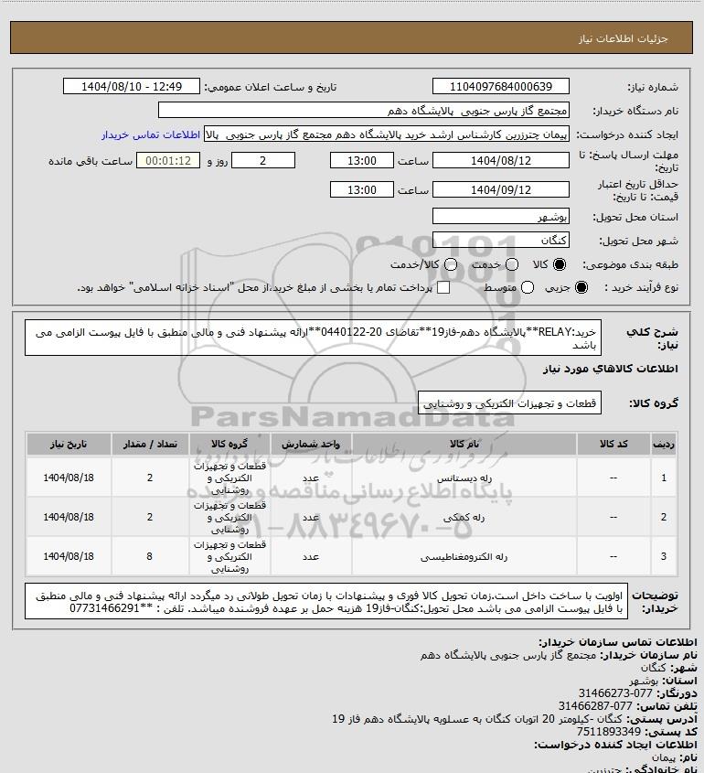 استعلام خرید:RELAY**پالایشگاه دهم-فاز19**تقاضای 20-0440122**ارائه پیشنهاد فنی و مالی منطبق با فایل پیوست الزامی می باشد, استعلام خرید:RELAY**پالایشگاه دهم-فاز19**تقاضای 20-0440122**ارائه پیشنهاد فنی و مالی منطبق با فایل پیوست الزامی می باشد
