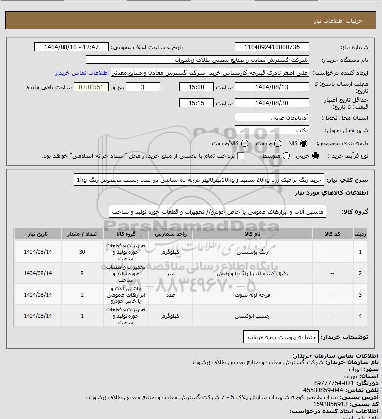 شرح کلی نیاز: خرید رنگ ترافیک زرد 20kg سفید 10kg jتینر8لیتر فرچه ده سانتی دو عدد چسب مخصوص رنگ 1kg