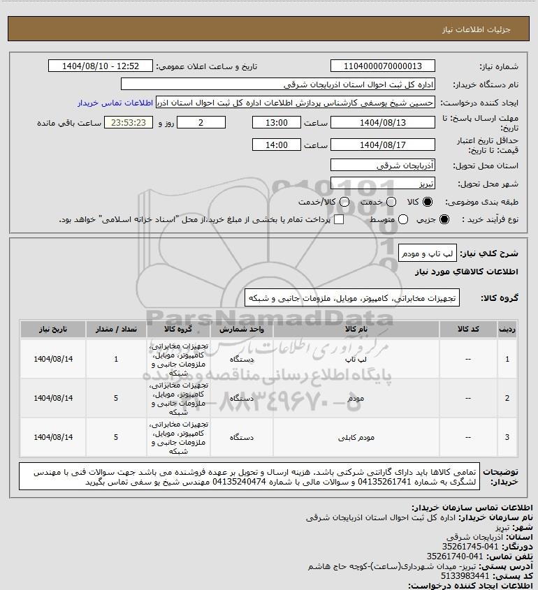 | 1 | -- | لپ تاپ | دستگاه | تجهیزات مخابراتی، کامپیوتر، موبایل، ملزومات جانبی و شبکه | 1 | 1404/08/14 |