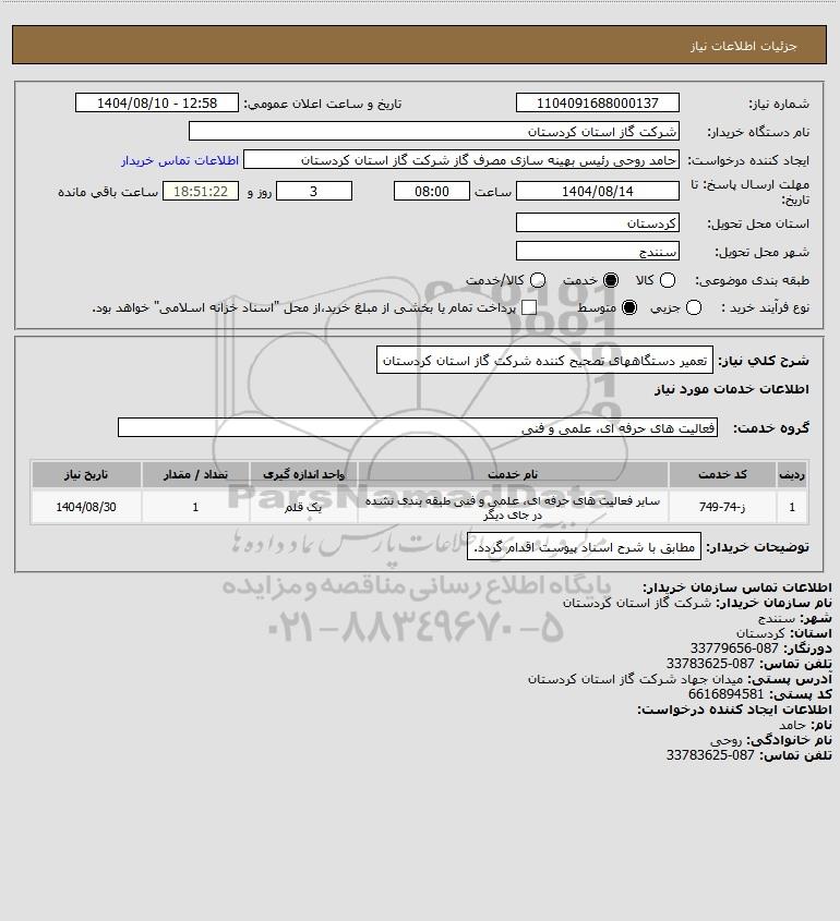 شرح کلی نیاز: تعمیر دستگاههای تصحیح کننده شرکت گاز استان کردستان