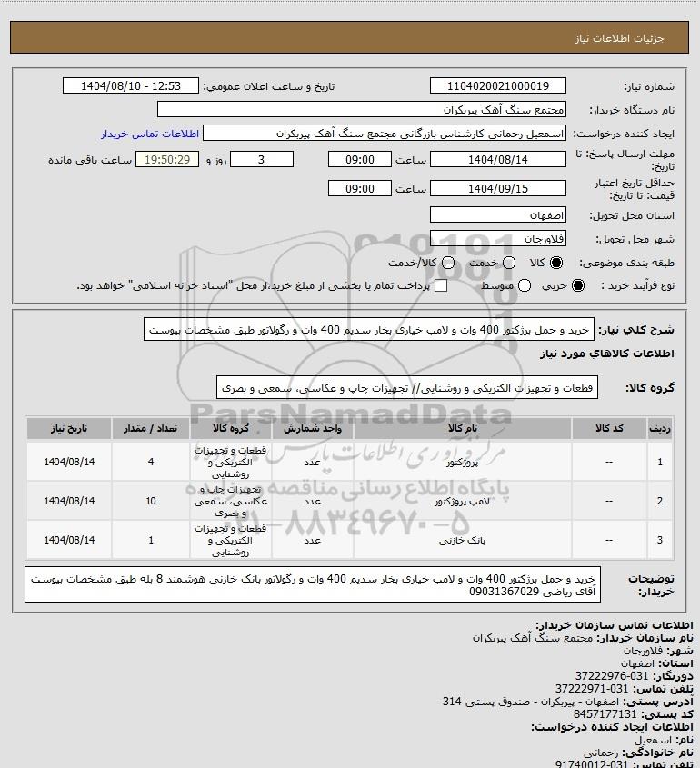 شرح کلی نیاز: خرید و حمل پرژکتور 400 وات و لامپ خیاری بخار سدیم 400 وات و رگولاتور طبق مشخصات پیوست