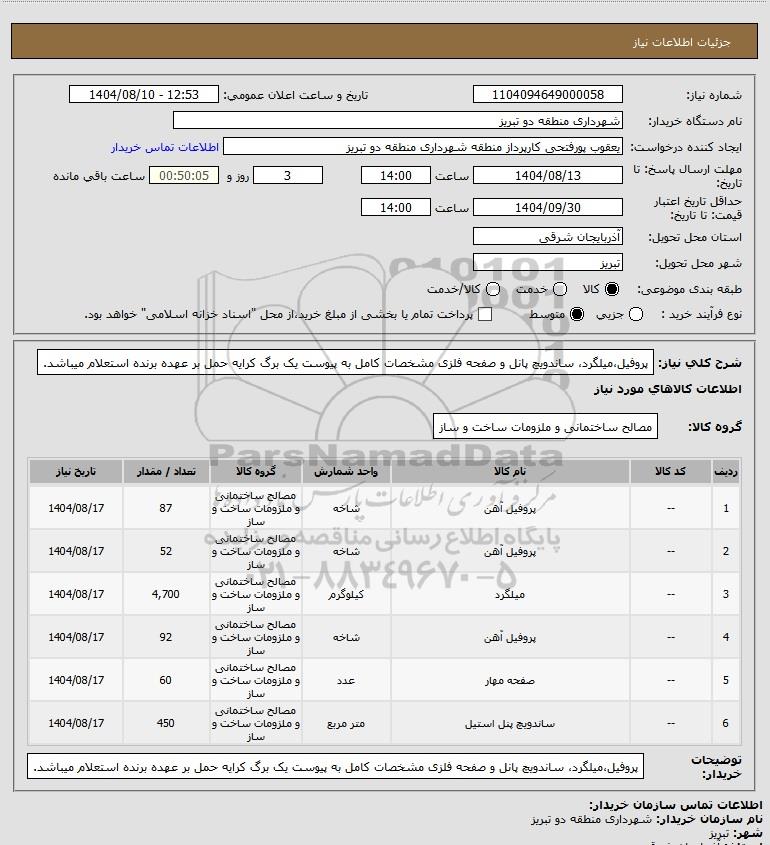 شرح کلی نیاز: پروفیل،میلگرد، ساندویچ پانل و صفحه فلزی مشخصات کامل به پیوست یک برگ کرایه حمل بر عهده برنده استعلام میباشد.