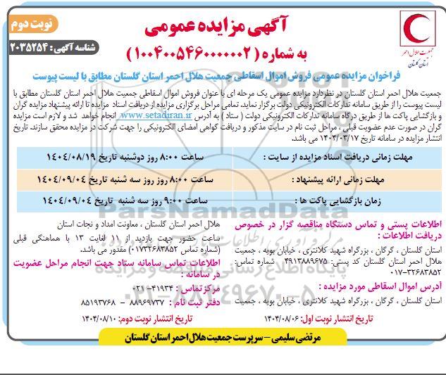 جمعیت هلال احمر استان گلستان در نظر دارد مزایده عمومی یک مرحله ای با عنوان فروش اموال اسقاطی جمعیت هلال احمر استان گلستان مطابق با لیست پیوست را از طریق سامانه تدارکات الکترونیکی دولت برگزار نماید تمامی مراحل برگزاری مزایده از دریافت اسناد مزایده تا ارائه پیشنهاد مزایده گران و بازگشایی پاکتها از طریق درگاه سامانه تدارکات الکترونیکی دولت (ستاد) به آدرس ستاد ایران انجام خواهد شد و لازم است. مزایده گران در صورت عدم عضویت قبلی، مراحل ثبت نام در سایت مذکور و دریافت گواهی امضای الکترونیکی را جهت شرکت در مزایده محقق سازند. تاریخ انتشار مزایده در سامانه تاریخ 1404.03.17 می باشد.