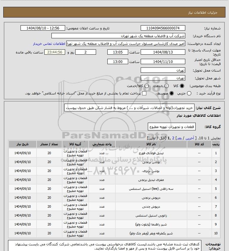 شرح کلی نیاز: خرید تجهیزات(لوله و اتصالات، شیرآلات و ... ) مربوط به فشار شکن طبق جدول پیوست