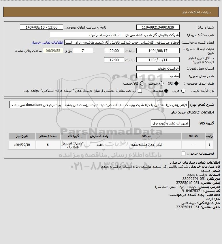 نام دستگاه خریدار:شرکت پالایش گاز شهید هاشمی نژاد استان خراسان رضوی