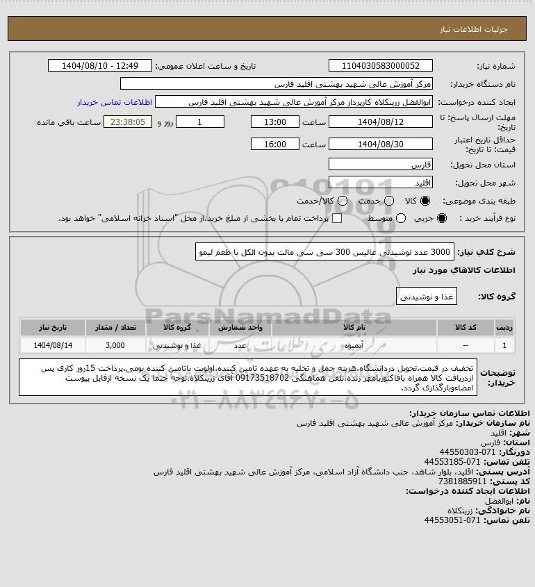 شرح کلی نیاز: 3000 عدد نوشیدنی عالیس 300 سی سی مالت بدون الکل با طعم لیمو