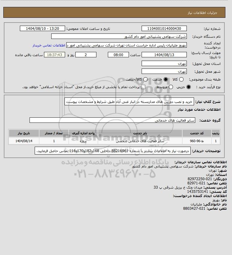 شرح کلی نیاز: خرید و نصب دوربین های مداربسته در انبار غنی آباد طبق شرایط و مشخصات پیوست