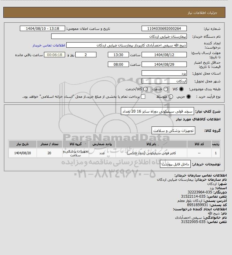 شرح کلی نیاز: سوند فولی سیلیکونی دوراه سایز 16 20 تعداد
