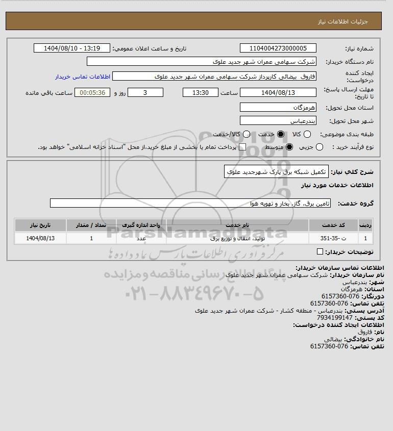 شرح کلی نیاز: تکمیل شبکه برق پارک شهرجدید علوی