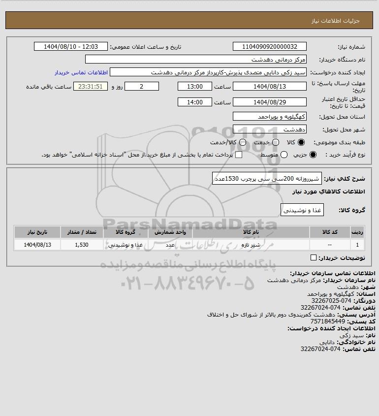 شرح کلی نیاز: شیرروزانه 200سی سی پرچرب 1530عدد