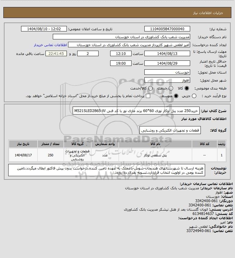 شرح کلی نیاز: خرید250 عدد پنل توکار نوری 60*60 برند مازی نور با کد فنی M521SLED2865-W