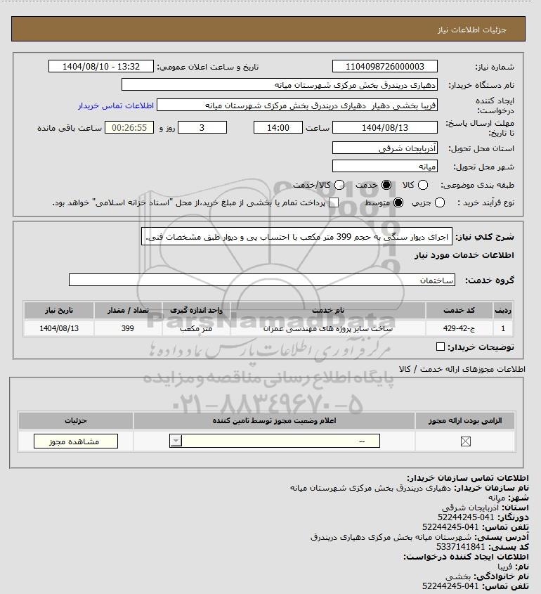 شرح کلی نیاز: اجرای دیوار سنگی به حجم 399 متر مکعب با احتساب پی و دیوار طبق مشخصات فنی.
