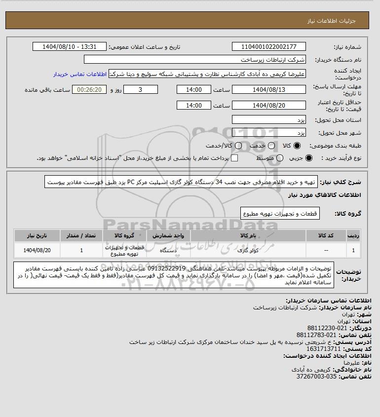 استعلام تهیه و خرید اقلام مصرفی جهت نصب 34 دستگاه کولر گازی اسپلیت مرکز PC یزد طبق فهرست مقادیر پیوست, استعلام تهیه و خرید اقلام مصرفی جهت نصب 34 دستگاه کولر گازی اسپلیت مرکز PC یزد طبق فهرست مقادیر پیوست