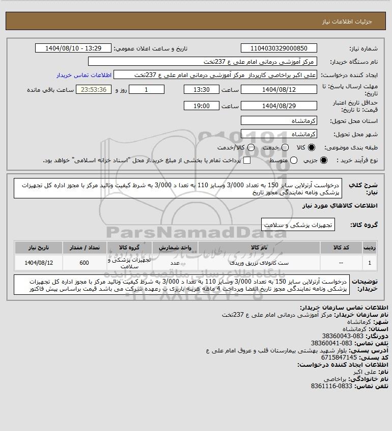 شرح کلی نیاز: درخواست آرترلاین سایز 150 به تعداد 3/000 وسایز 110 به تعدا د 3/000 به شرط کیفیت وتائید مرکز با مجوز اداره کل تجهیزات پزشکی ونامه نمایندگی مجوز تاریخ