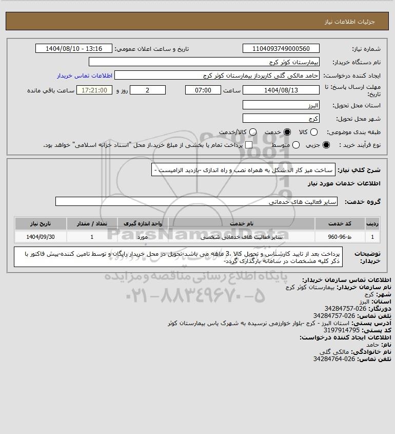 استعلام بها و موضوع استعلام استعلام ساخت میز کار ال شکل به همراه نصب و راه اندازی -بازدید الزامیست - به اطلاع کلیه شرکتها و افراد متخصص واجد شرایط میرساند، آگهی گذار در نظر دارد از طریق استعلام بها، نسبت به انتخاب و دریافت پیشنهادات اقدام نماید. این استعلام با کد آگهی ثبت شده در سامانه خبرگزاری پارس نماد : 9781621 منتشر شده است. مشخصات استعلام : تاریخ شروع استعلام: 1404/08/10 آخرین مهلت ارسال پیشنهاد قیمت : 1404/08/13 و محل اجرای پروژه : استان البرز میباشد. استعلام قیمت مورد درخواست : استعلام ساخت میز کار ال شکل به همراه نصب و راه اندازی -بازدید الزامیست - با دستهبندیهای تخصصی و گروه های مرتبط : مصنوعات چوبی و مبلمان اداری, استعلام اطلاع رسانی میگردد.