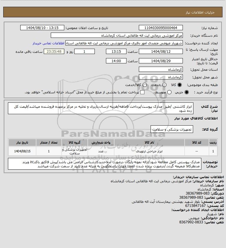 | 1 | -- | ابزار جراحی ارتوپدی | عدد | تجهیزات پزشکی و سلامت | 1 | 1404/08/15 |