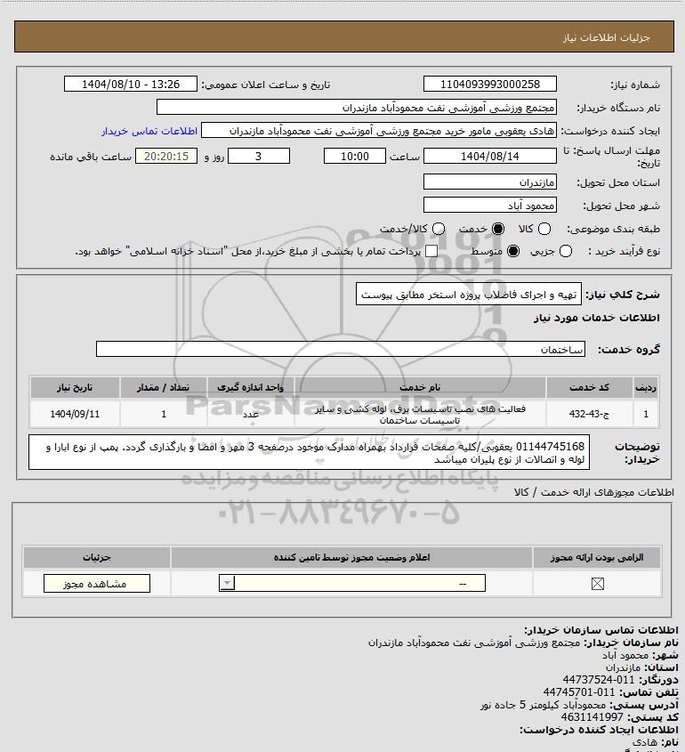 شرح کلی نیاز: تهیه و اجرای فاضلاب پروژه استخر مطابق پیوست