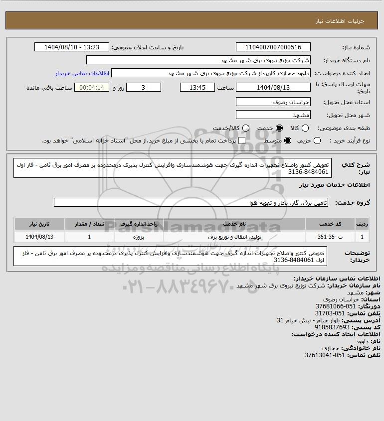 توضیحات خریدار:تعویض کنتور واصلاح تجهیزات اندازه گیری جهت هوشمندسازی وافزایش کنترل پذیری درمحدوده پر مصرف امور برق ثامن - فاز اول 8484061-3136