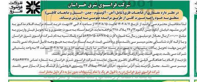 در نظر دارد مقداری از ضایعات فلزی (شامل: آهن، آلومینیوم، چدن، استیل و ضایعات کابلی) متعلق به خود را به صورت کلی از طریق مزایده عمومی به فروش برساند.
