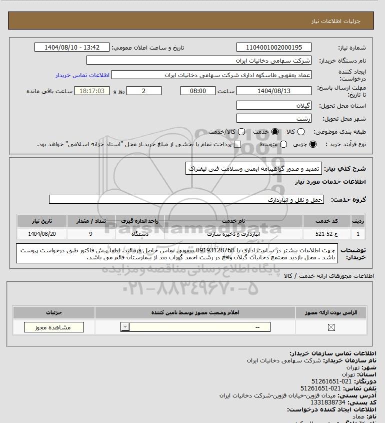 شرح کلی نیاز: تمدید و صدور گواهینامه ایمنی وسلامت فنی لیفتراک