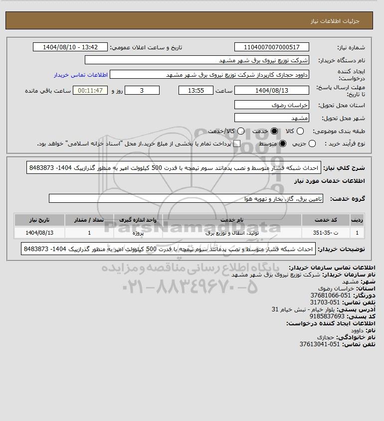 توضیحات خریدار:احداث شبکه فشار متوسط و نصب پدمانتد سوم تیمچه با فدرت 500 کیلوولت امپر به منظور گذرازپیک 1404- 8483873