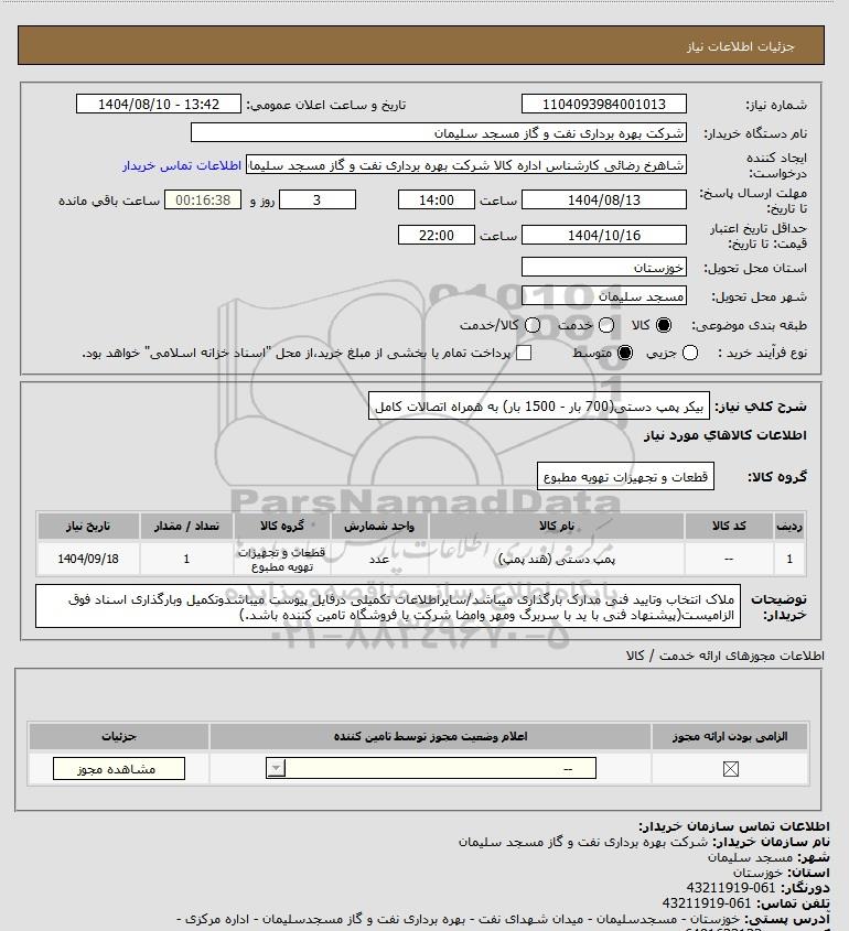 شرح کلی نیاز: بیکر پمپ دستی(700 بار - 1500 بار) به همراه اتصالات کامل
