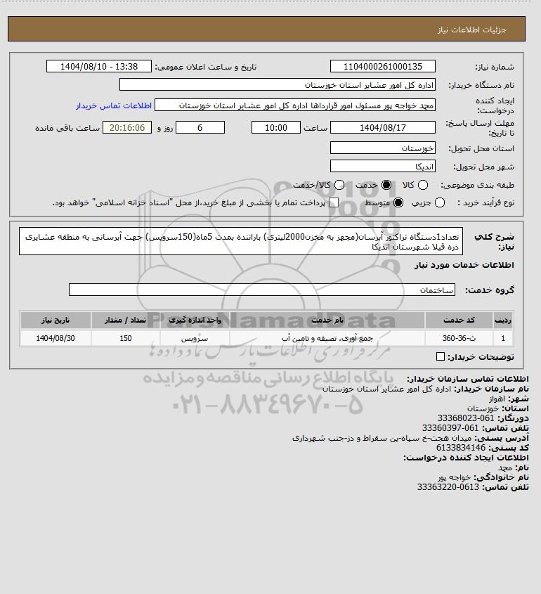 استعلام تعداد1دستگاه تراکتور آبرسان(مجهز به مخزن2000لیتری) باراننده بمدت 5ماه(150سرویس) جهت آبرسانی به منطقه عشایری دره قیلا شهرستان اندیکا, استعلام تعداد1دستگاه تراکتور آبرسان(مجهز به مخزن2000لیتری) باراننده بمدت 5ماه(150سرویس) جهت آبرسانی به منطقه عشایری دره قیلا شهرستان اندیکا