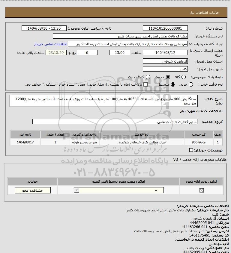 شرح کلی نیاز: سنگفرش 400 متر مربع-ابرو کاسه ای 30*40 به متراژ100 متر طول---اسفالت ریزی به ضخامت 4 سانتی متر به متراژ1200 متر مربع