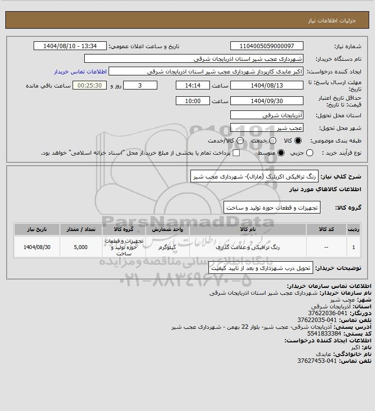 شرح کلی نیاز: رنگ ترافیکی اکریلیک (مارال)- شهرداری عجب شیر