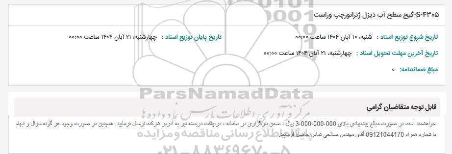 در صورت نیاز به دریافت راهنمایی یا پشتیبانی در خصوص استعلام و مناقصه و فراخوان مناقصه عمومی، مناقصه محدود، مناقصه بین المللی، مناقصه دولتی، مناقصه خصوصی، مناقصه آنلاین فروش تجهیزات، مناقصه مشاورهای مناقصه پتروشیمی و انرژی مناقصه صنایع و تجهیزات برق و مخابرات و نفت و گاز ... لطفاً با سایت خبری مناقصه و مزایده پارسنماد دادهها به شماره 88349670 تماس حاصل فرمایید.