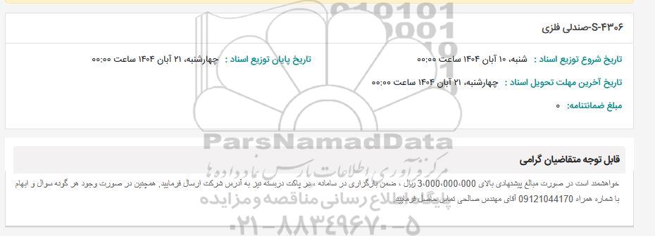 تاریخ آخرین مهلت تحویل اسناد: چهارشنبه، 21 آبان 1404 ساعت 00:00