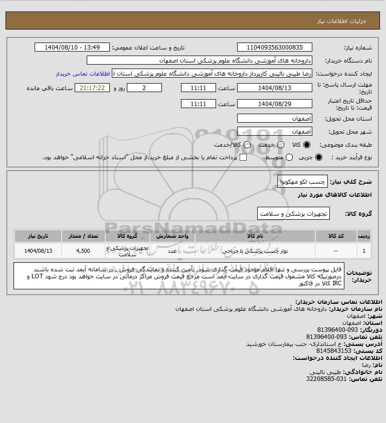 | 1 | -- | نوار چسب پزشکی یا جراحی | عدد | تجهیزات پزشکی و سلامت | 4,500 | 1404/08/13 |