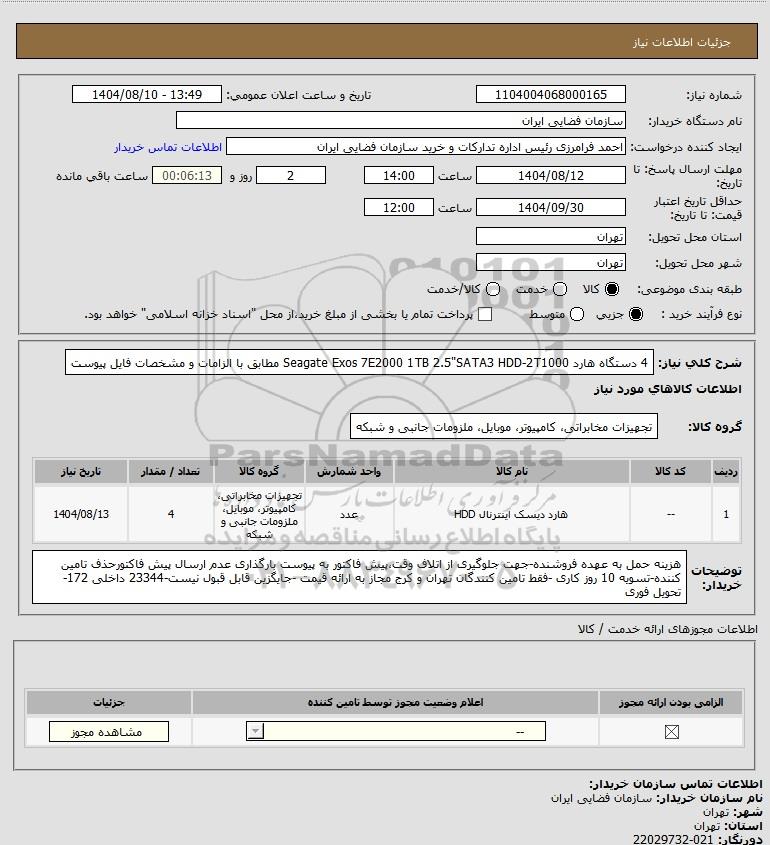 | 1 | -- | هارد دیسک اینترنال HDD | عدد | تجهیزات مخابراتی، کامپیوتر، موبایل، ملزومات جانبی و شبکه | 4 | 1404/08/13 |
