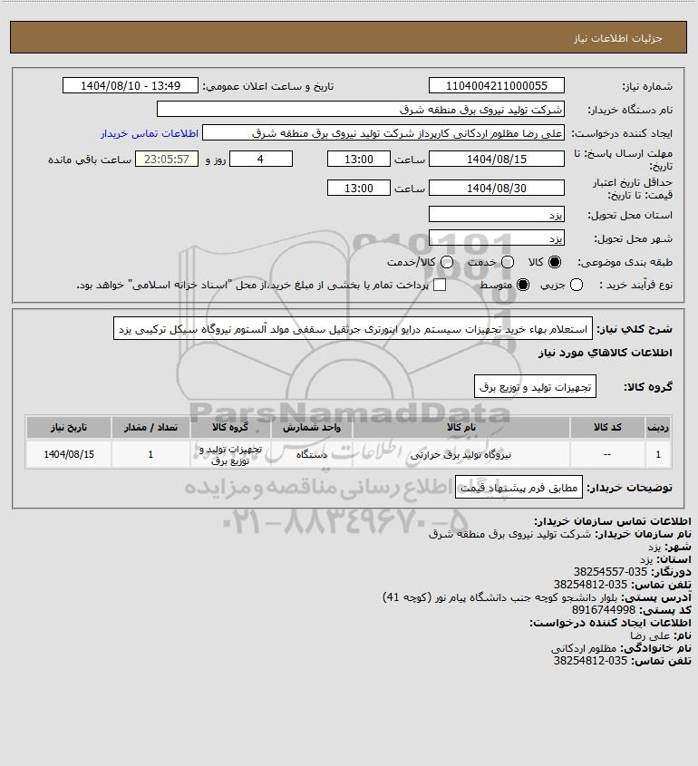 | 1 | -- | نیروگاه تولید برق حرارتی | دستگاه | تجهیزات تولید و توزیع برق | 1 | 1404/08/15 |