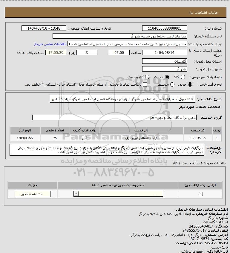 استعلام انتقال برق اضطراری تامین اجتماعی بندرگز از ژنراتور درمانگاه تامین اجتماعی بندرگزبمیزان 25 آمپر, استعلام انتقال برق اضطراری تامین اجتماعی بندرگز از ژنراتور درمانگاه تامین اجتماعی بندرگزبمیزان 25 آمپر