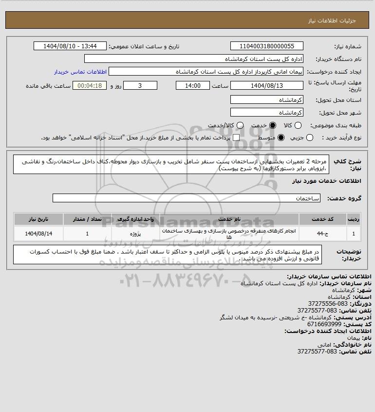 شرح کلی نیاز: مرحله 2 تعمیرات بخشهایی ازساختمان پست سنقر شامل تخریب و بازسازی دیوار محوطه،کناف داخل ساختمان،رنگ و نقاشی ،ایزوبام، برابر دستورکارفرما (به شرح پیوست)
