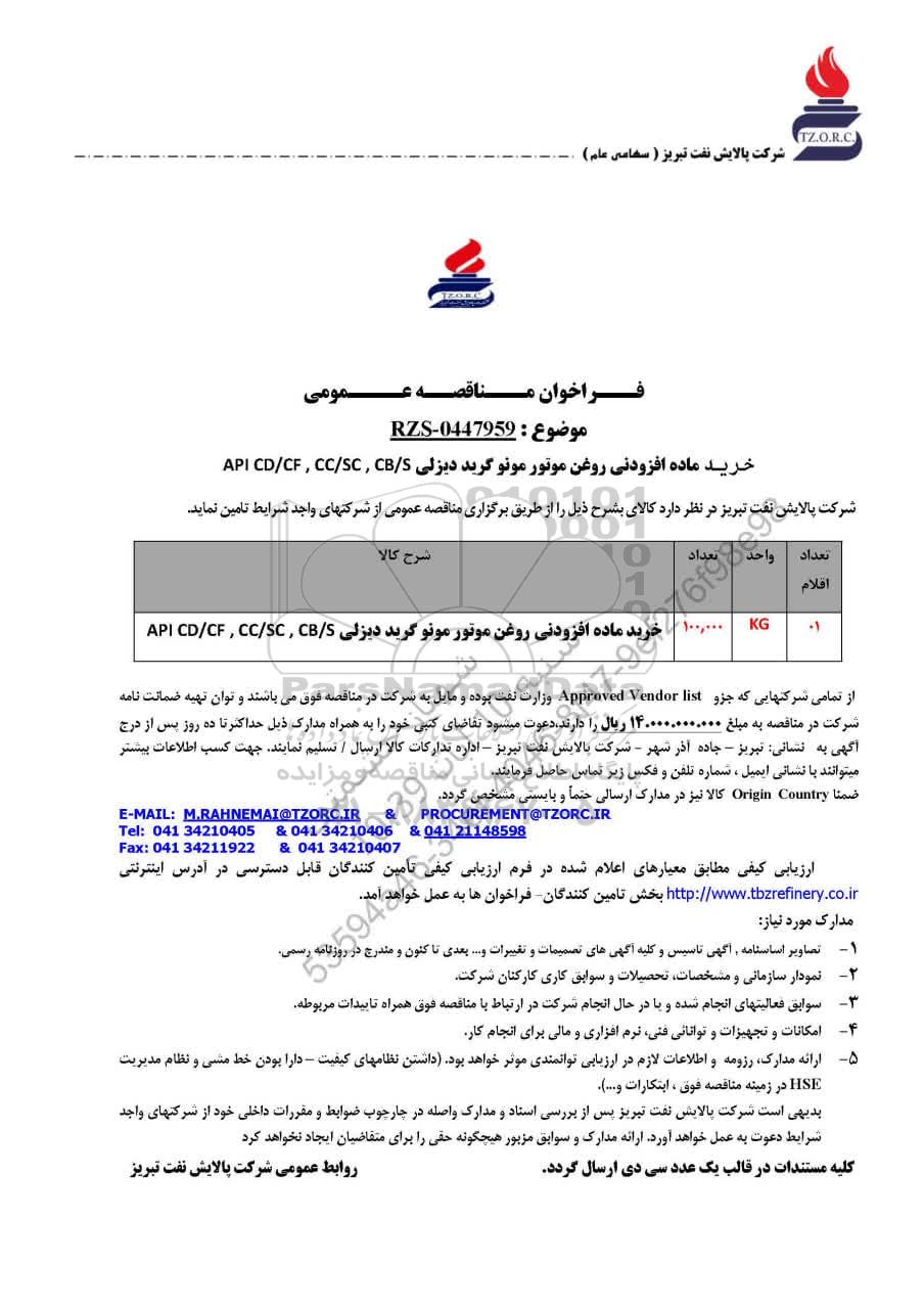 10 مناقصه ماده افزودنی روغن موتور مولتی گرید دیزلی 9786575 1404/08/11 new not special not payed آذربایجان شرقی