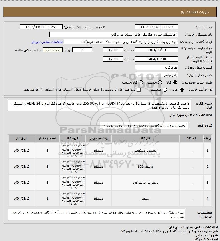 شرح کلی نیاز: 3 عدد کامپیوتر بامشخصات i3 نسل10 به بعد-ram DDR4 (4gb) به بالا-ssd 256 -مانیتور 3 عدد 22 اینچ یا 24 HDMI و اسپیکر -پرینتر تک کاره اداری 3 عدد-
