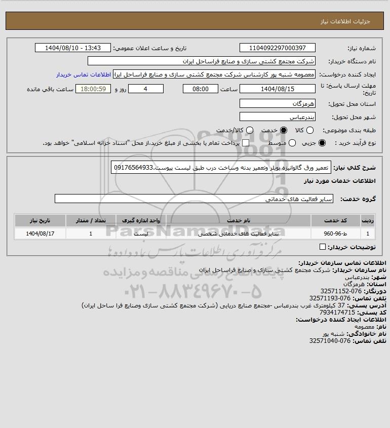 شرح کلی نیاز: تعمیر ورق گالوانیزه بویلر وتعمیر بدنه وساخت درب طبق لیست پیوست.09176564933