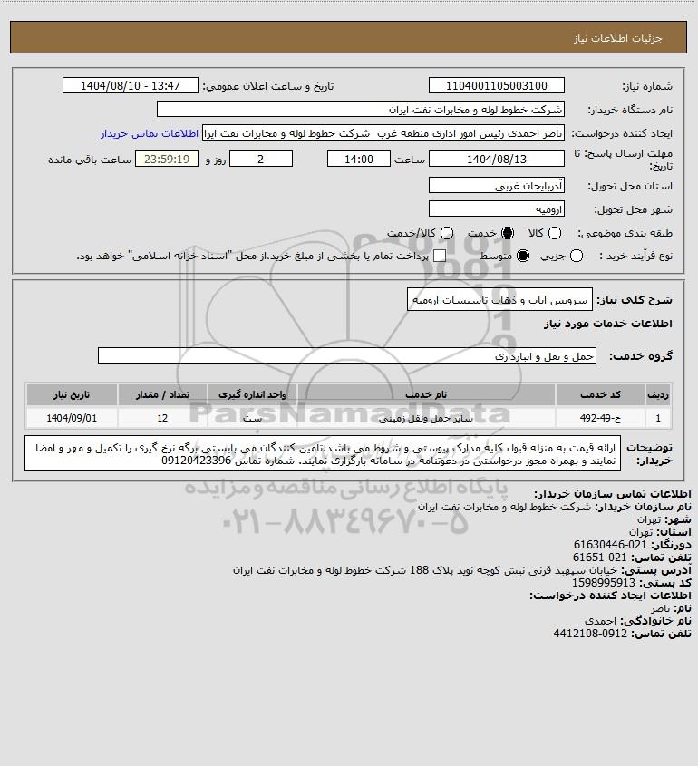 شرح کلی نیاز: سرویس ایاب و ذهاب تاسیسات ارومیه