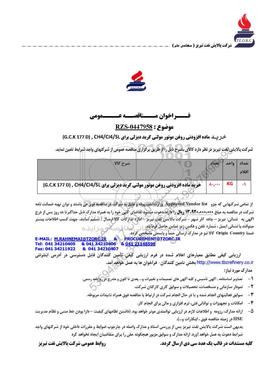 از تمامی شرکتهایی که جزء Approved vendor List وزارت نفت بوده و مایل به شرکت در مناقصه فوق می باشند و توان تهیه ضمانت نامه شرکت در مناقصه به مبلغ 13.920.000.000 ریال را دارند، دعوت می شود تقاضای کتبی خود را به همراه مدارک ذیل حداکثر تا ده روز پس از درج آگهی به نشانی: تبریز - جاده آذرشهر - شرکت پالایش نفت تبریز- اداره تدارکات کالا ارسال/ تسلیم نمایند. جهت کسب اطلاعات بیشتر می توانید با نشانی ایمیل، شماره تلفن و فکس زیر تماس حاصل فرمایید.