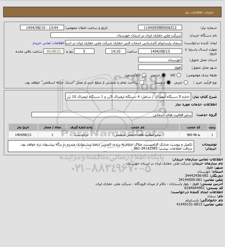 شرح کلی نیاز: اجاره 5 دستگاه لیفتراک / شامل: 4 دستگاه لیفتراک 5تن و 1 دستگاه لیفتراک 10 تن