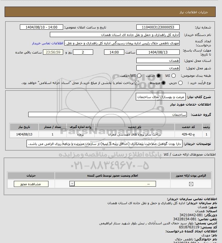 توضیحات خریدار:دارا بودن گواهی صلاحیت پیمانکاری (حداقل رتبه 5 ابنیه) از سازمان مدیریت و برنامه ریزی الزامی می باشد.