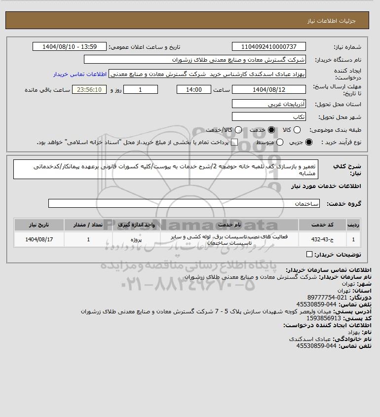 شرح کلی نیاز: تعمیر و بازسازی کف تلمبه خانه حوضچه 2/شرج خدمات به پیوست/کلیه کسورات قانونی برعهده پیمانکار/کدخدماتی مشابه