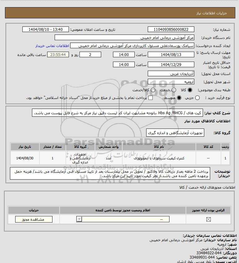 شرح کلی نیاز: کیت های / Hbs Ag /BHCG ،باتوجه مشابهت ایران کد لیست دقیق نیاز مرکز به شرح فایل پیوست می باشد.