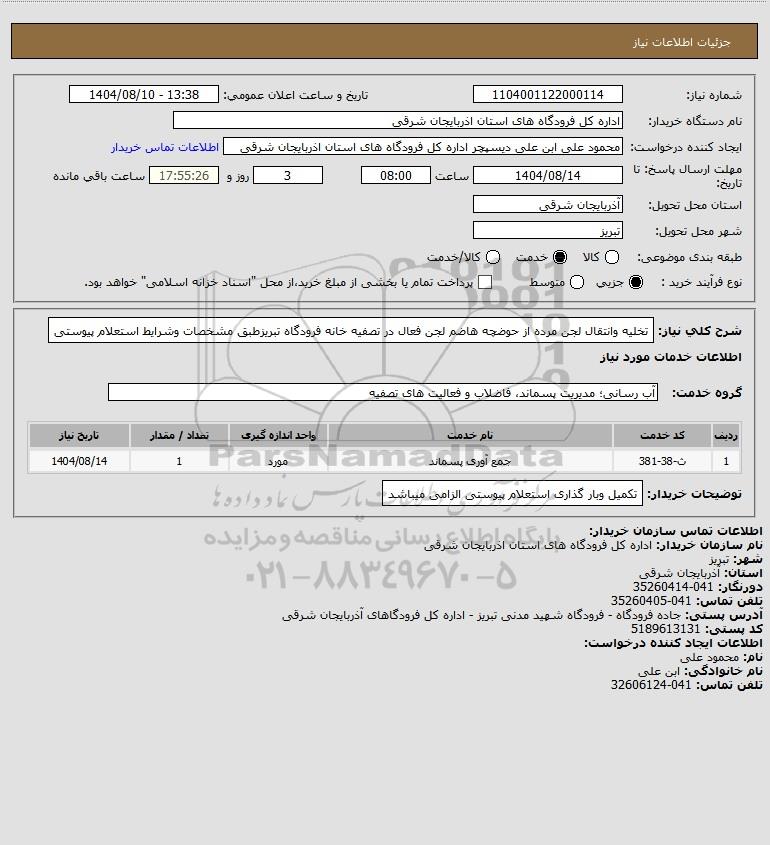 شرح کلی نیاز: تخلیه وانتقال لجن مرده از حوضچه هاضم لجن فعال در تصفیه خانه فرودگاه تبریزطبق مشخصات وشرایط استعلام پیوستی