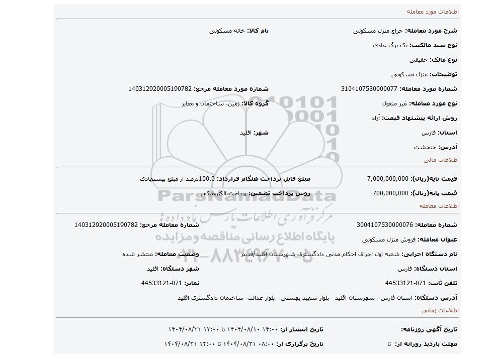 | شرح مورد معامله: حراج منزل مسکونی | نام کالا: خانه مسکونی | |